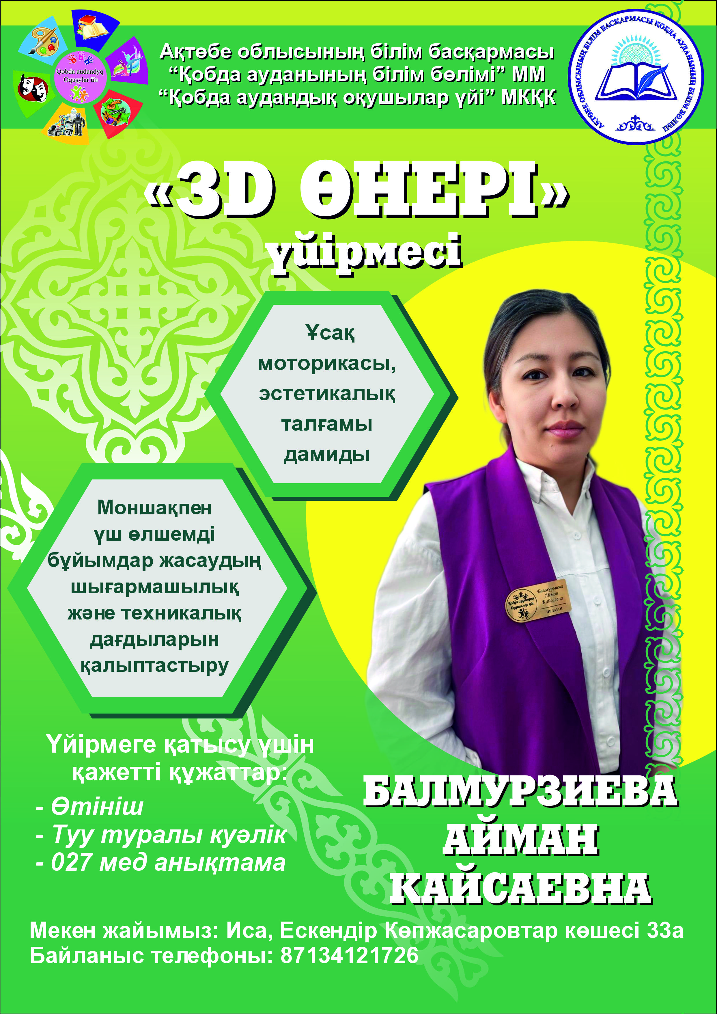 «BiserStyle» , «MarjanTrend» , «3D өнері», «Шашбау» үйірмелерінің жетекшісі