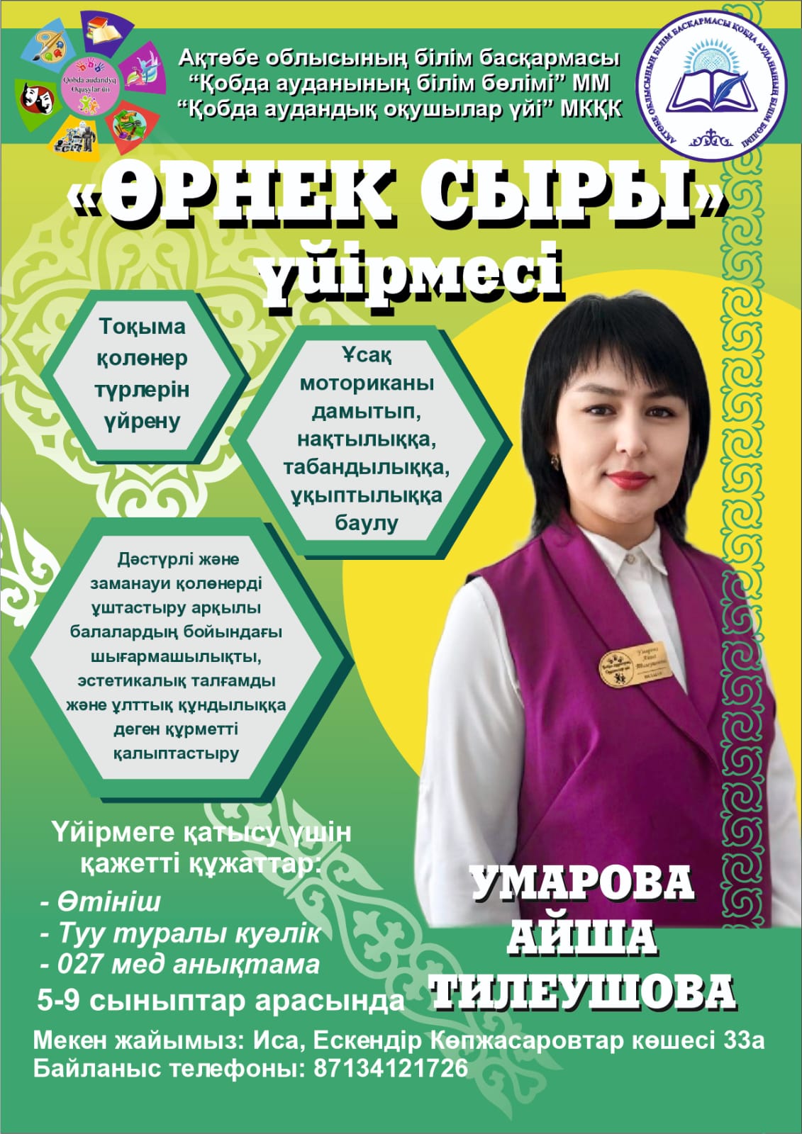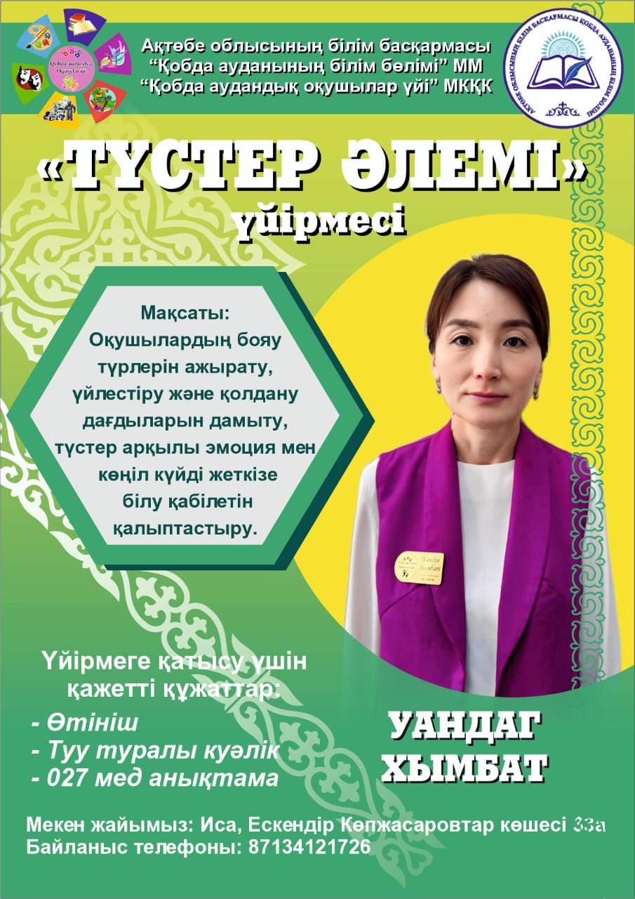 «Шығармашылық шуағы », «Көркем қиял», «Қазақ өнері», «Түстер әлем» үйірмелерінің жетекшісі
