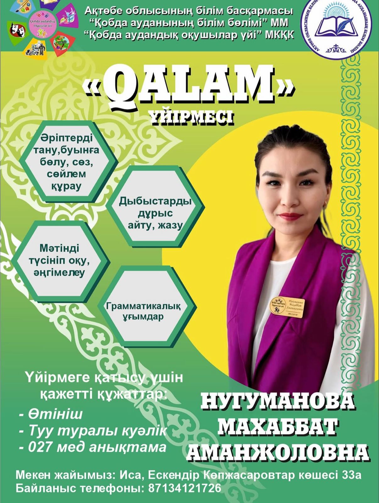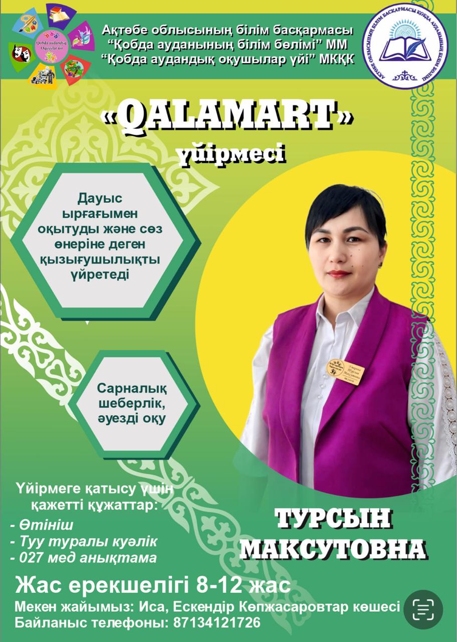 «Туған жер- Тravel Club», «Oқу Bost», « Qalamart», «QalamQuest «, «Айшықты сөздер әлемі» үйірмелерінің жетекшісі
